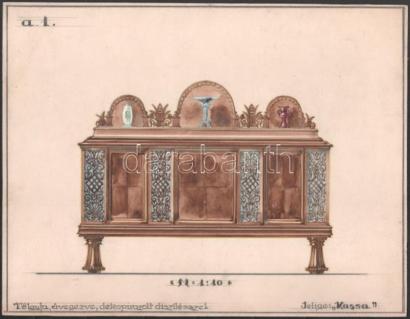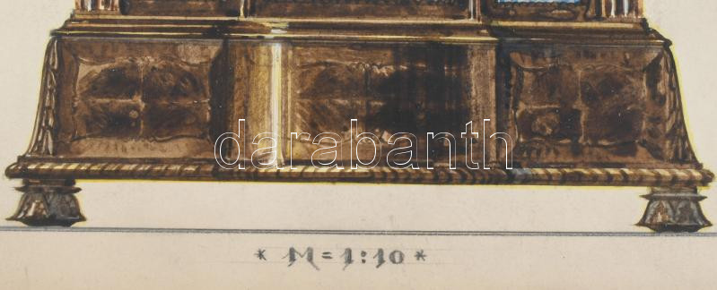 cca 1900-1940 Historizáló tölgyfa bútor tervrajza. Akvarell, ceruza, karton, m 1:10, jelzés nélkül, jelige: "Kassa", hátoldalán felületi sérülésekkel, 25×32,5 cm