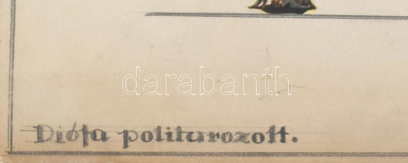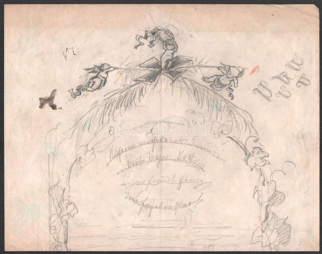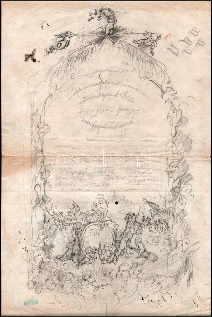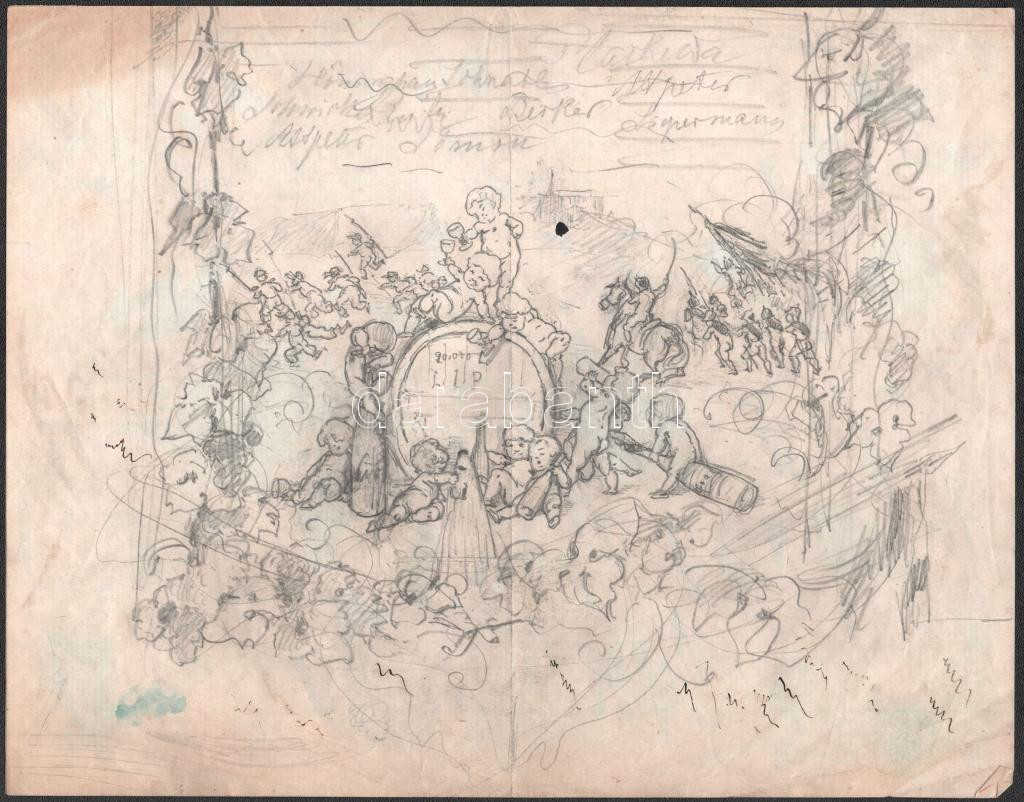 Jelzés nélkül, XIX. sz. vége/XX. sz. eleje: Jelenet katonákkal és puttókkal (oklevél- vagy plakátterv?). Ceruza, akvarell, papír. Hajtásnyom mentén kisebb szakadással. 45x29 cm.