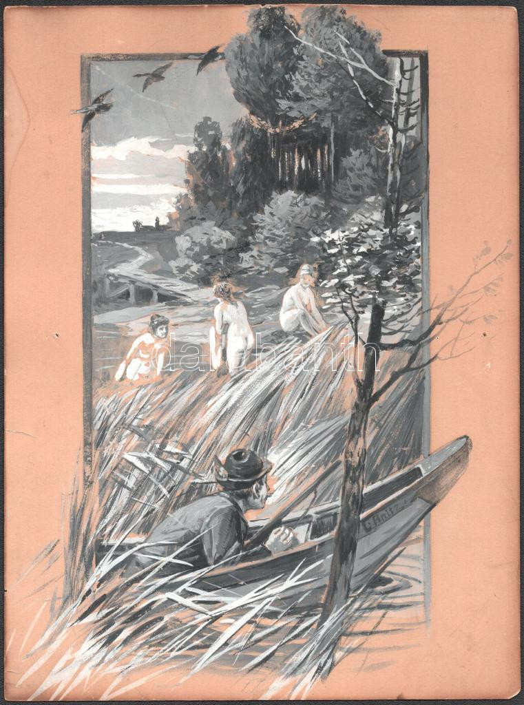 Anitz jelzéssel, XIX sz. vége/XX. sz. eleje: Női aktok és vadász puskával. Tempera, karton, jelzett, lapszéli kisebb szakadással és kisebb ázásnyommal, 28x21 cm