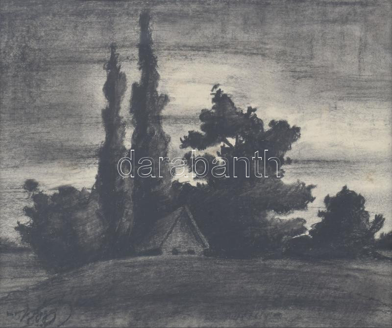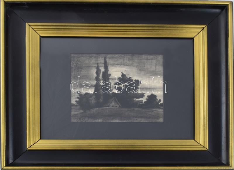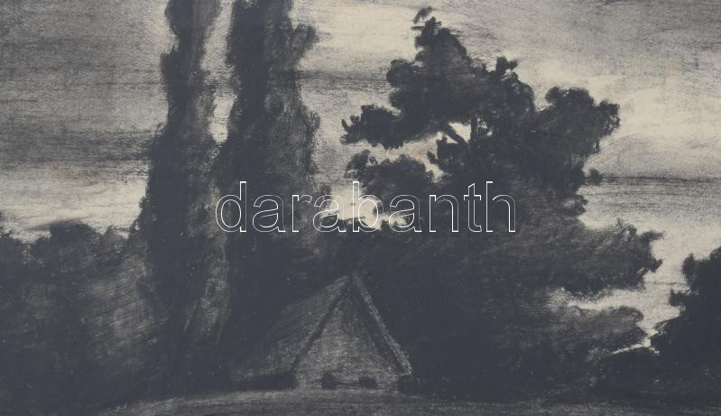 Nagy I jelzéssel: Táj házikóval. Szén, papír. Hátoldalán "Etának szeretettel Imre 1922" felirattal. Dekoratív, üvegezett fakeretben. 15x18 cm