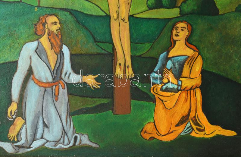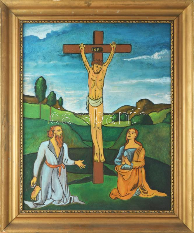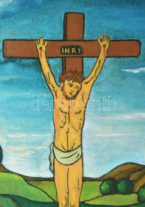 Olvashatatatlan jelzéssel: Krisztus a Kereszten. Olaj, karton. Dekoratív, kissé sérült fakeretben. 50x40 cm.