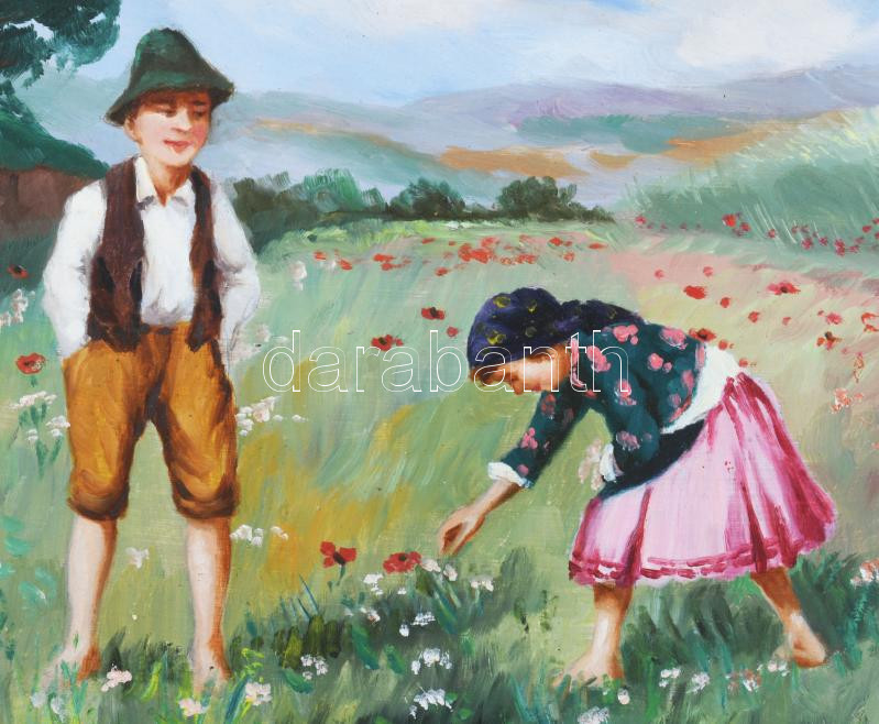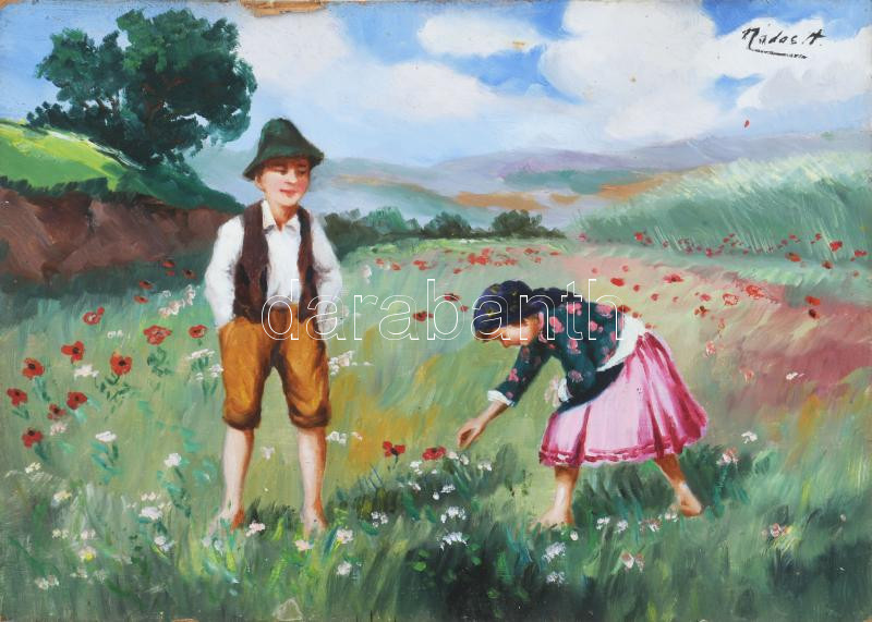 Nádas A jelzéssel: Gyerekek a réten. Olaj, karton. Kissé sérült. 24,5x34,5 cm