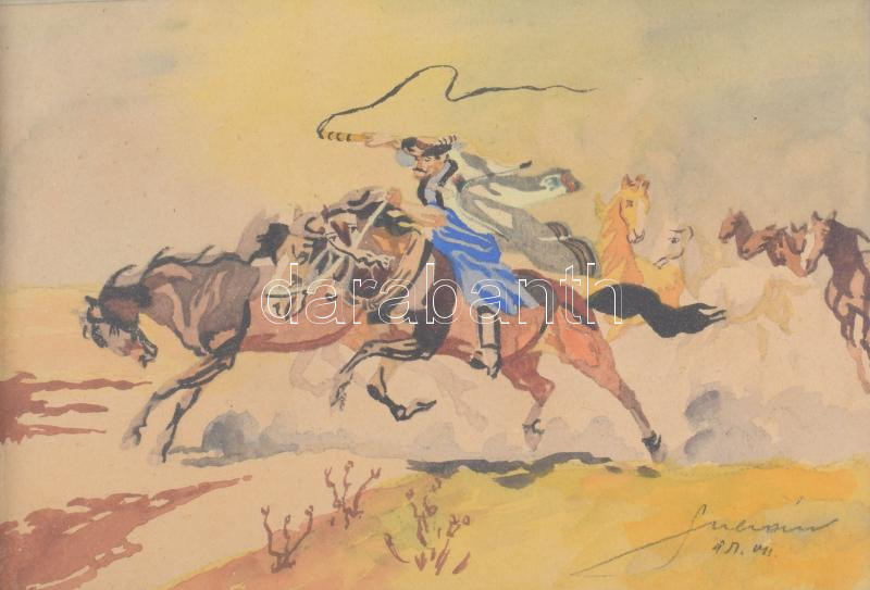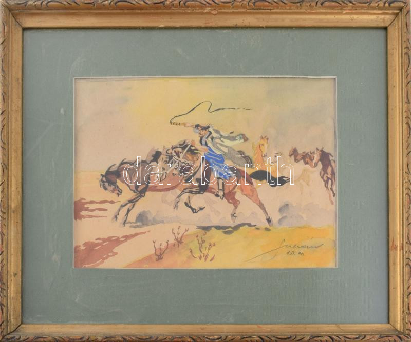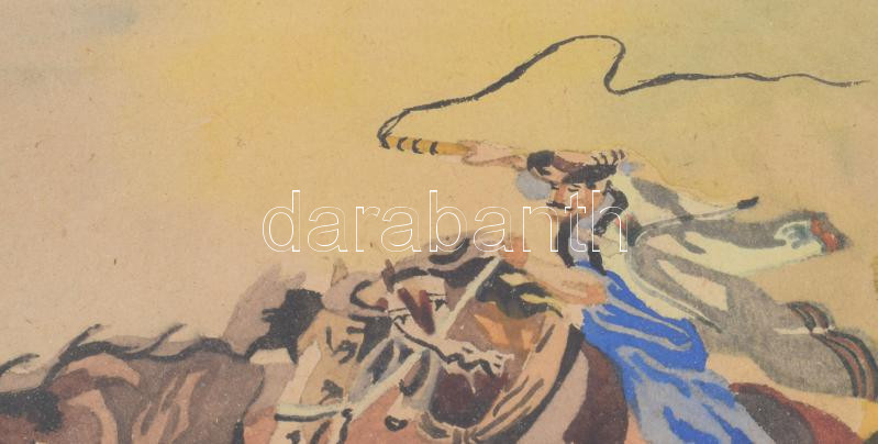 Olvashatatlan jelzéssel: Csikós lovakkal. Akvarell, papír, üvegezett fakeretben, 17,5×25 cm