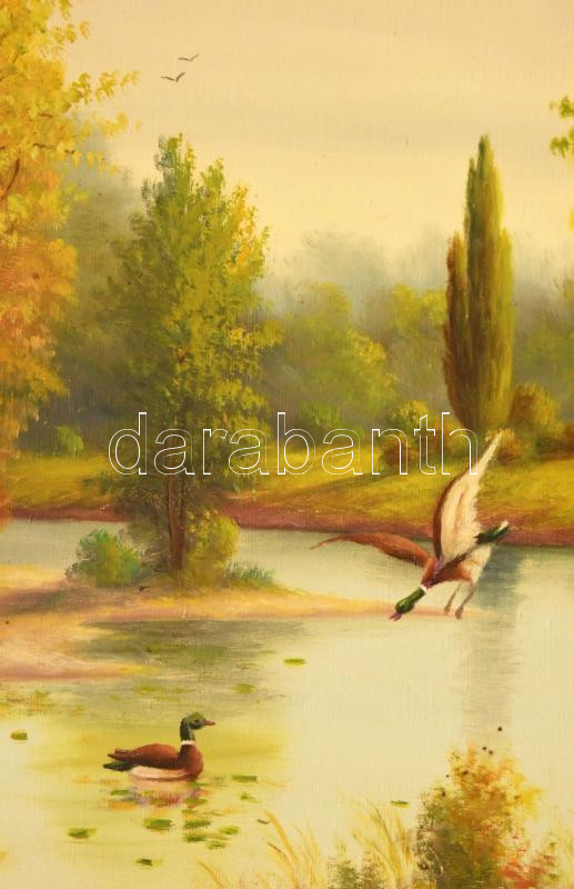 Olvashatatlan jelzéssel: Felröppenő vadkacsák. Olaj, vászon. Dekoratív, sérült fakeretben. 60x80 cm