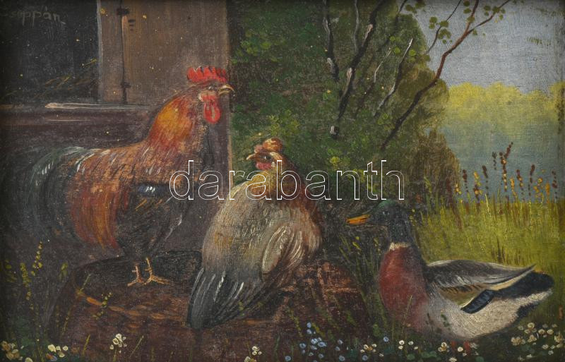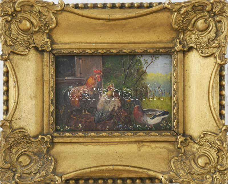 Zsuppán jelzéssel, XX. sz. első fele: Kakas és kacsa. Olaj, karton. Dekoratív, sérült fakeretben, 10x14 cm