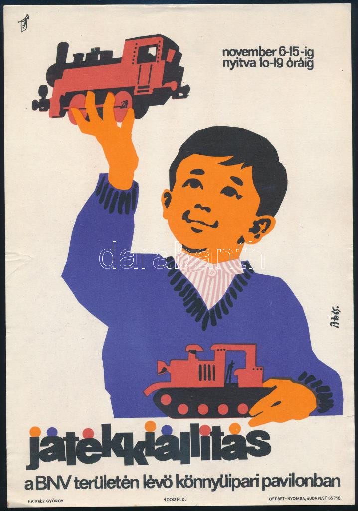 1965 Játékkiállítás a BNV területén lévő könnyűipari pavilonban, 1964, villamosplakát, papír, jelzett a plakáton (B Zs? szignóval). Offset-Nyomda. Lapszéli kisebb szakadásokkal. 24x16,5 cm