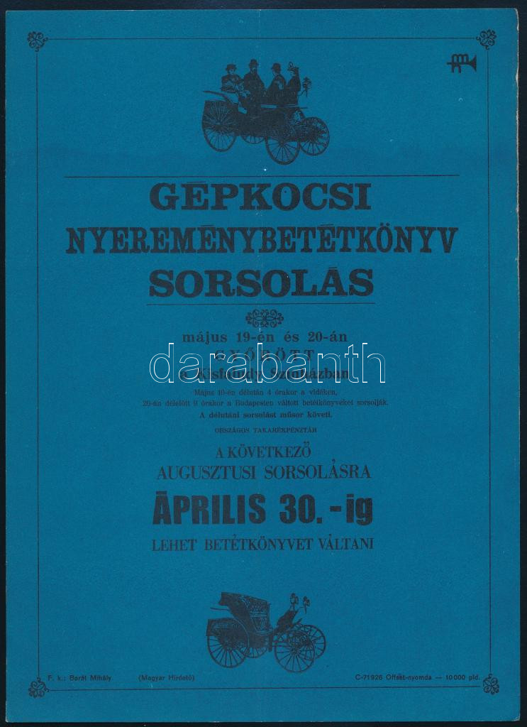 1971 Gépkocsi nyereménybetétkönyv sorsolás május 19-én és 20-án Győrött a Kisfaludy Színházban. Villamosplakát, ofszet, papír, jelzés nélkül, Offset Nyomda, hajtásnyommal, 23,5x16,5 cm.