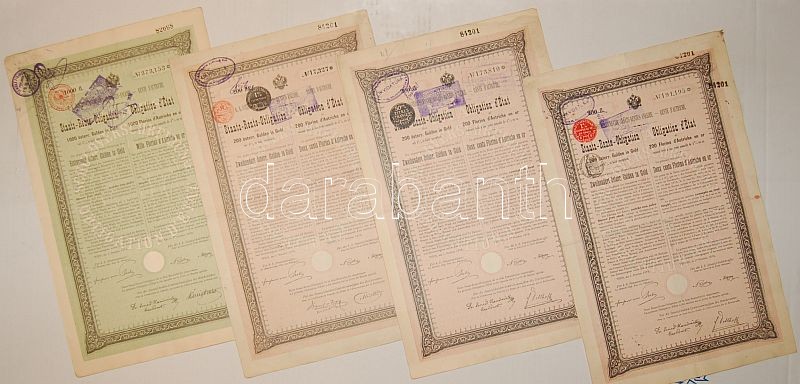 Beschreibung: 1876.Ausztria 200G (3x) + 1000G + Magyarország 1000Ft Járadékkölcsön (4x) klf. szignettákkal (német,francia), cseh érvényesítő bélyegzőkkel!