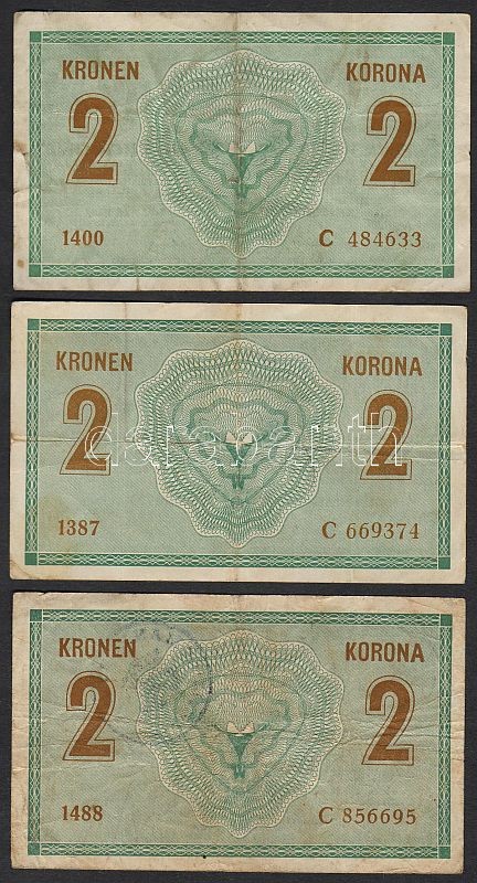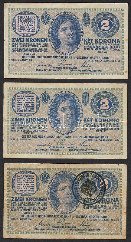 1914. 2K 3 klf "C" típussal + egyiken román ellenbélyegző! T:II https://www.darabanth.com/de/53-Fernauktion/53.0/Numismatik/~217/1914-2K-3-klf-C-tipussal-plus-egyiken-roman-ellenbelyegzo-TII~II103750