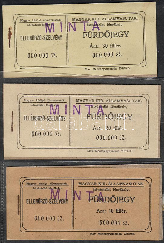 Beschreibung: 1930-as évek Magyar kir. Államvasutak Fürdőjegy 10f + 20f + 30f "000-ás" minták R! T:I