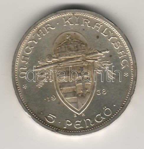 1938. 5P Ag "Szt. István" T:2+ pici ph https://www.darabanth.com/de/53-Fernauktion/53.0/Numismatik/~217/1938-5P-Ag-Szt-Istvan-T2plus-pici-ph~II102778