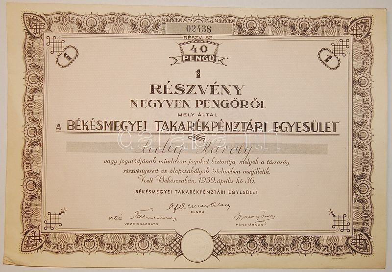 1939. Békésmegyei Takarékpénztári Egyesület részvény 40P-ről https://www.darabanth.com/de/53-Fernauktion/53.0/Numismatik/~217/1939-Bekesmegyei-Takarekpenztari-Egyesulet-reszveny-40P-rol~II103960