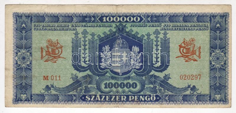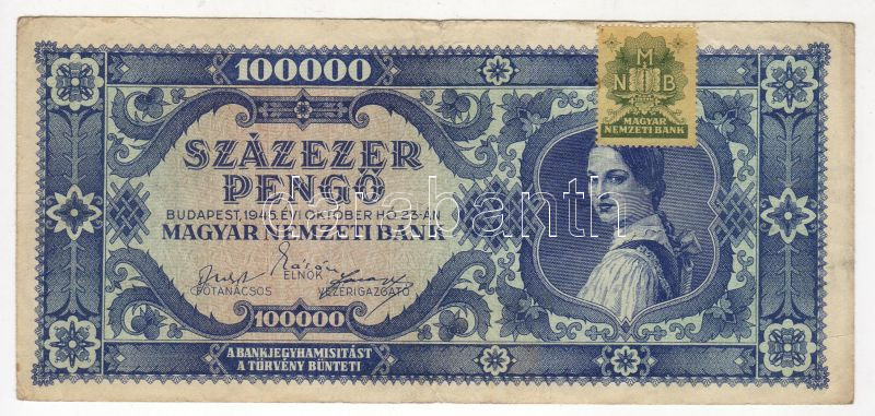 1945. 100.000P "kék" bélyeggel T:II-/III https://www.darabanth.com/de/53-Fernauktion/53.0/Numismatik/~217/1945-100000P-kek-belyeggel-TII-III~II103065