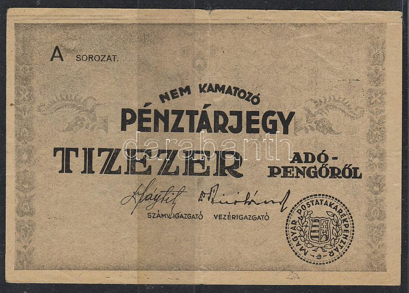 1946. Pénztárjegy 10.000Adópengő elöl "másra át nem ruházható" szöveg ... https://www.darabanth.com/de/53-Fernauktion/53.0/Numismatik/~217/1946-Penztarjegy-10000Adopengo-elol-masra-at-nem-ruhazhato-szoveg-es-sorozatszam-hiC3~II103769