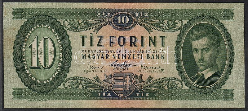 1947. 10Ft T:II+ Csak egyszer hajtva, picit foltos https://www.darabanth.com/de/53-Fernauktion/53.0/Numismatik/~217/1947-10Ft-TIIplus-Csak-egyszer-hajtva-picit-foltos~II103756