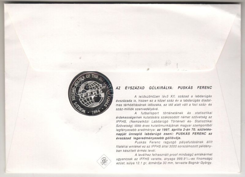 Beschreibung: 1996. "Puskás Ferenc" Ag 12,1g bélyeges borítékon T:PP Csak 3000db! R!