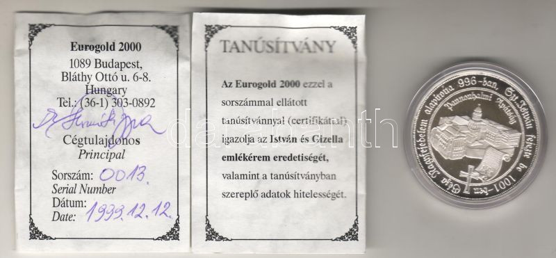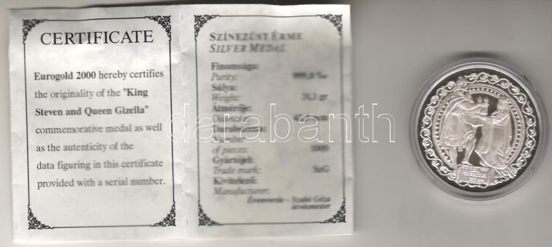 1999. "István és Gizella" Ag 31,1g T:PP Eredeti dísztokban, tanúsítván... https://www.darabanth.com/de/53-Fernauktion/53.0/Numismatik/~217/1999-Istvan-es-Gizella-Ag-31-1g-TPP-Eredeti-disztokban-tanusitvannyal-csak-1000db-R~II103806