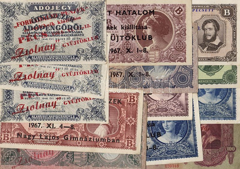 Beschreibung: 21db (18 klf) "pengő" bankjegy 1960-as évekbeli kiállítási felülnyomásokkal T:II