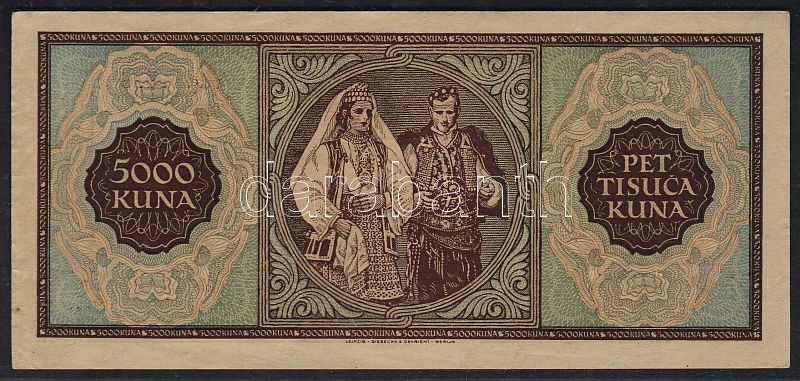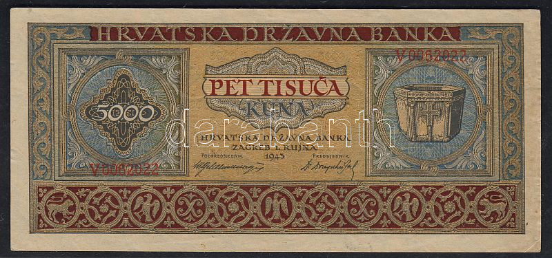 Horvátország 1943.07.15. 5000K T:I- https://www.darabanth.com/de/53-Fernauktion/53.0/Numismatik/~217/Horvatorszag-19430715-5000K-TI-~II103102