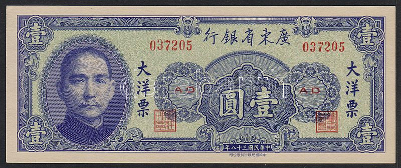Kína/ Kwangtung Provincial Bank 1949. 1Y T:I https://www.darabanth.com/de/53-Fernauktion/53.0/Numismatik/~217/Kina-Kwangtung-Provincial-Bank-1949-1Y-TI~II103117