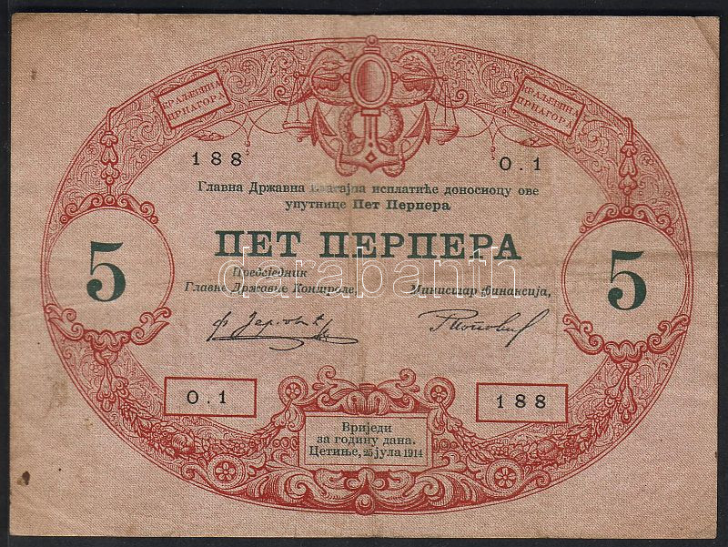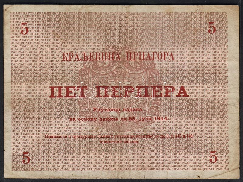 Montenegro 1914. 5P T:II foltos https://www.darabanth.com/de/53-Fernauktion/53.0/Numismatik/~217/Montenegro-1914-5P-TII-foltos~II103084