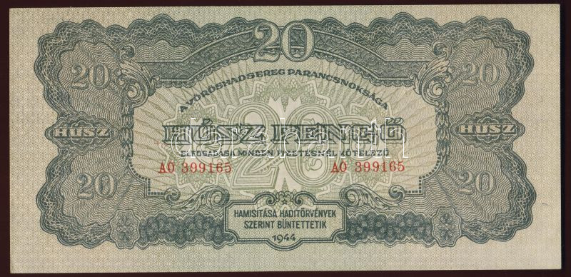 Beschreibung: 1944. 20P "V.H." mindkét oldalon felcsúszott nyomattal T:I