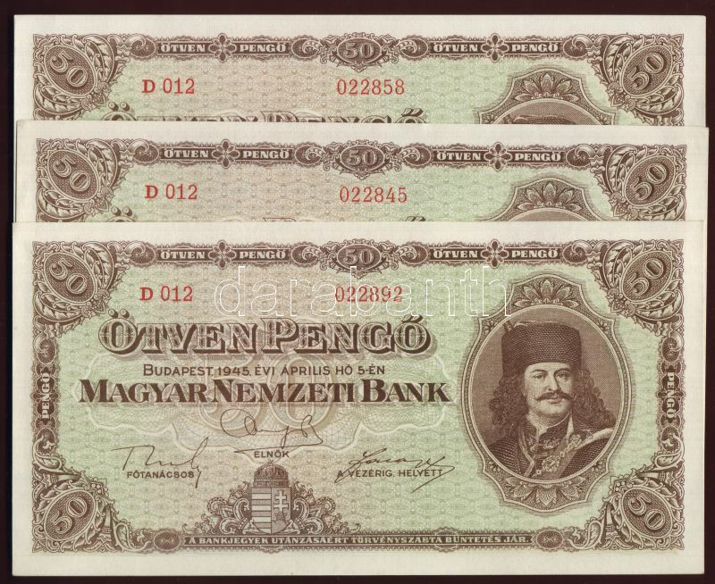 1945. 50P (3x) kevés ugrású sorszámokkal T:I https://www.darabanth.com/de/57-Fernauktion/57.0/Numismatik/~136/1945-50P-3x-keves-ugrasu-sorszamokkal-TI~II115479