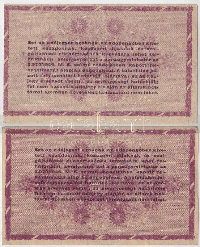1946. 100.000Adópengő (2x) egyik hátlapi nyomata extrém lefelé ás balra + keret balra és felfelé, illetve a másik hátlapi szövege erősen felfelé csúszva T:II