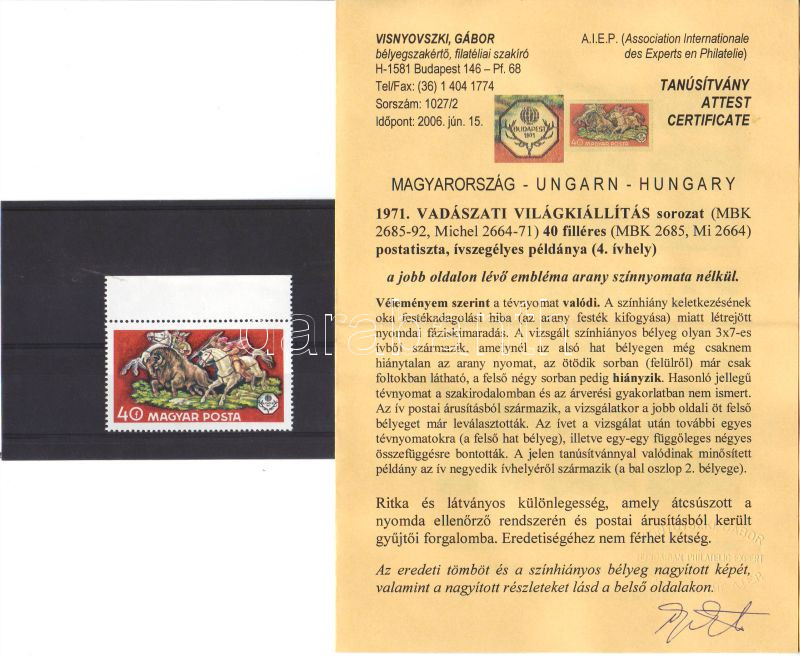 1971 Vadászati világkiállítás 40f arany színnyomat nélkül (a bélyeg kerete, évszám, tervező neve és az embléma alapszíne hiányzik) Visnyovszki fotóatteszt