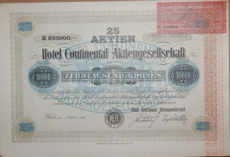1923 250 000 K Hotel Continantal AG. részvény / Share https://www.darabanth.com/de/6-Gross-Auktion/6.1/Kunst-Dokumente/~1657/1923-250-000-K-Hotel-Continantal-AG-reszveny-Share~II139337