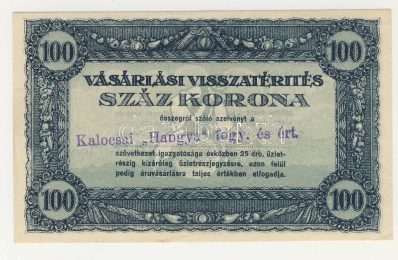 Beschreibung: 1920-as évek eleje 100K vásárlási visszatérítés "Kalocsai Hangya fogy. és ért." T:I-