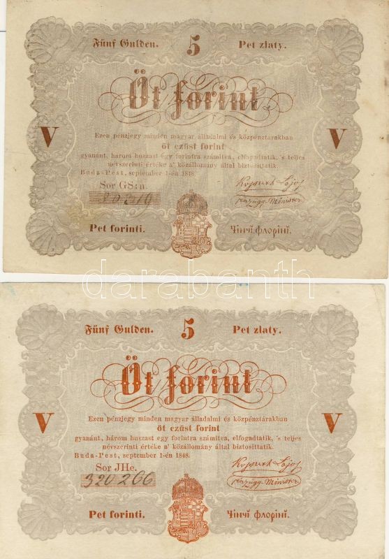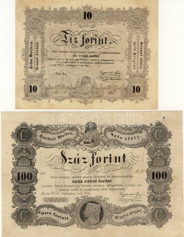 1848-49. 1Ft,2Ft,2Ft (fekete),5Ft 2klf színvariáns,10Ft,100Ft R! T:A b... https://www.darabanth.com/de/62-Fernauktion/62.0/Numismatik/~187/1848-49-1Ft-2Ft-2Ft-fekete-5Ft-2klf-szinvarians-10Ft-100Ft-R-TA-bankjegyek-ki-vannak-tisztit~II123298