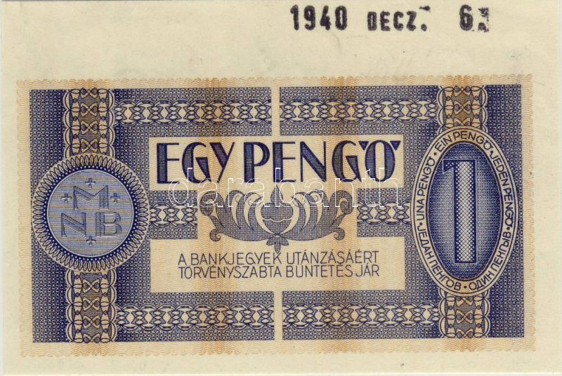 1938. 1P csak hátlapi fázisnyomat, felső ívszéllel, "1940 DECZ.6." bél... https://www.darabanth.com/de/62-Fernauktion/62.0/Numismatik/~187/1938-1P-csak-hatlapi-fazisnyomat-felso-ivszellel-1940-DECZ6-belyegzovel-TI~II123289
