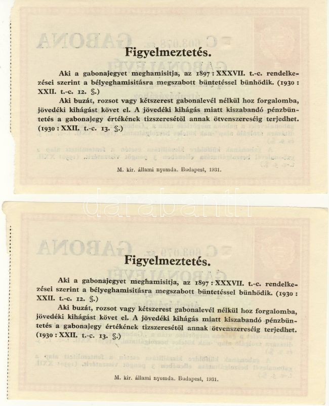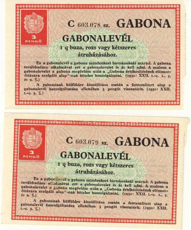 1931. Gabonalevél 3P (2x) egymásutáni sorszámokkal klf T:I https://www.darabanth.com/de/62-Fernauktion/62.0/Numismatik/~188/1931-Gabonalevel-3P-2x-egymasutani-sorszamokkal-klf-TI~II123195