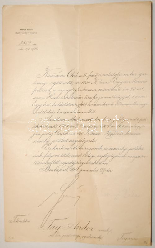 Beschreibung: 1911 Kinevezési okmány Serényi Béla földművelésügyi miniszter alűáírásával