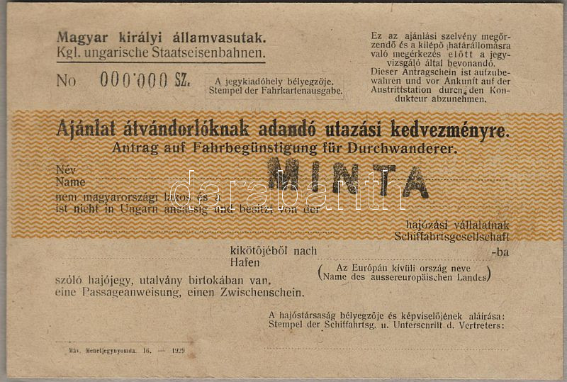 Beschreibung: 1929. Magyar kir. Államvasutak "Ajánlat átvándorlóknak adandó utazási kedvezményre" "000-ás" Minta! R!