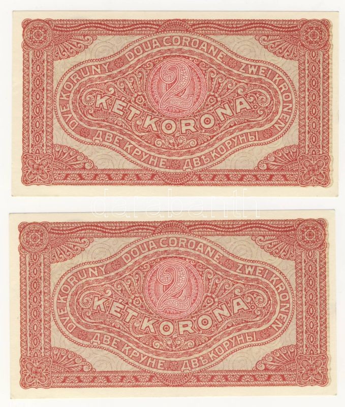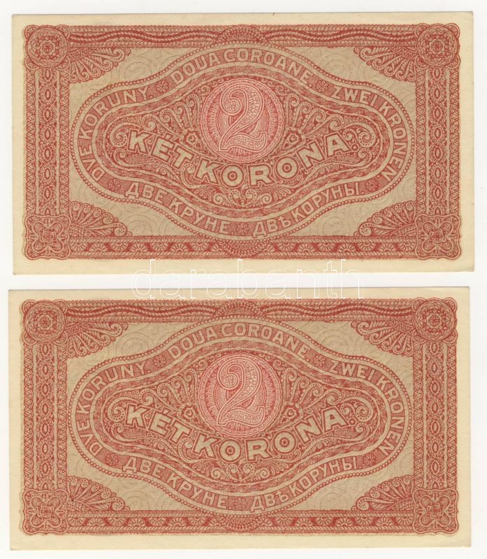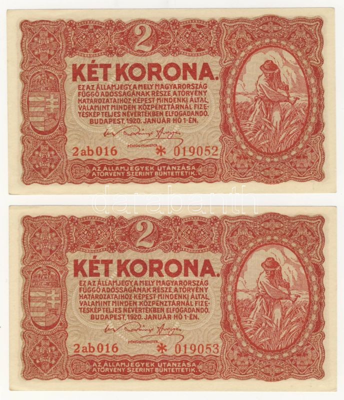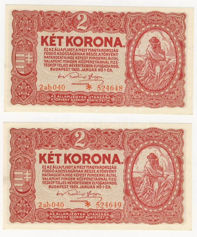 1920. 2K "*"-gal 2x2db egymásutáni sorszámokkal T:I https://www.darabanth.com/de/65-Fernauktion/65.0/Numismatik/~246/1920-2K-gal-2x2db-egymasutani-sorszamokkal-TI~II127833
