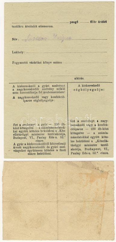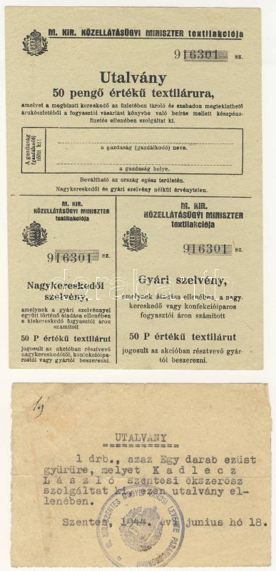 Beschreibung: 1940-es évek "utalvány 50P értékű textilárura" + "utalvány 1db ezüst gyűrűre"