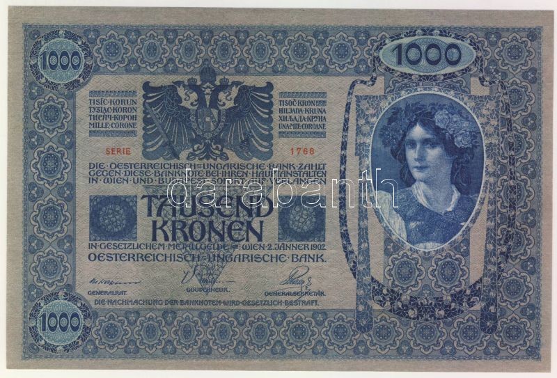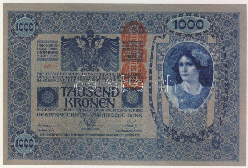 Ausztria 1902. 1000K "Deutschösterreich" függőleges, piros fny-sal T:I https://www.darabanth.com/de/65-Fernauktion/65.0/Numismatik/~246/Ausztria-1902-1000K-Deutschosterreich-fuggoleges-piros-fny-sal-TI~II127812