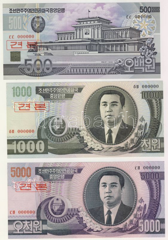 Észak-Korea 1998-2002. 500W,1000W,5000W "Specimen 000" fny-sal T:I https://www.darabanth.com/de/65-Fernauktion/65.0/Numismatik/~246/Eszak-Korea-1998-2002-500W-1000W-5000W-Specimen-000-fny-sal-TI~II127793