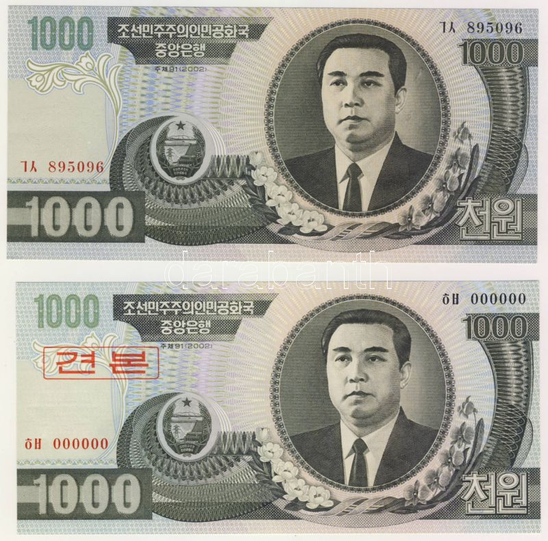 Észak-Korea 2002. 1000W (2x), az egyik "Specimen" fny-sal, 000-ás soro... https://www.darabanth.com/de/65-Fernauktion/65.0/Numismatik/~246/Eszak-Korea-2002-1000W-2x-az-egyik-Specimen-fny-sal-000-as-sorozatszammal-TI~II127787