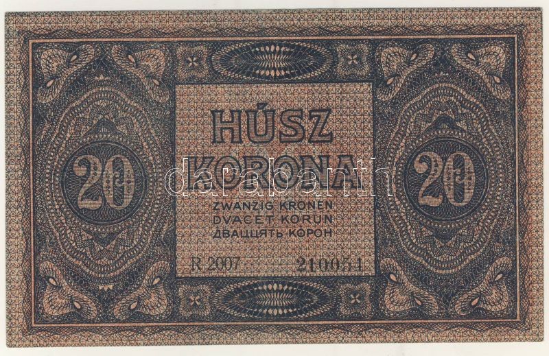 1919. augusztus 20. 20K előoldalon jobb felső saroknál festékfolt, hátoldalon egyenetlenül nyomott sorszámok! T:I- jelentéktelen, alig észlelhető repedés felül