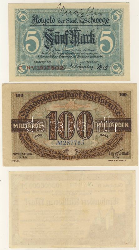 Beschreibung: Német Birodalom 1919-1923. 5 klf szükségpénz Hanau 500.000M T:III/IV, Glauchan 100.000.000M T:II, Neustadt 1000.000M T:I, Eschwege 5M T:I, Karlsruhe 100.000.000.000M T:II/III
