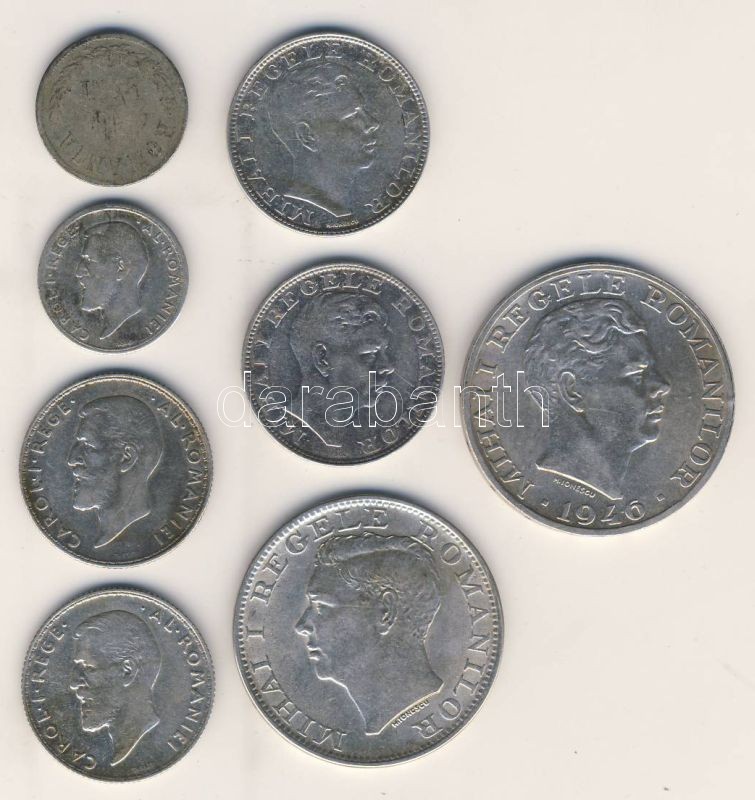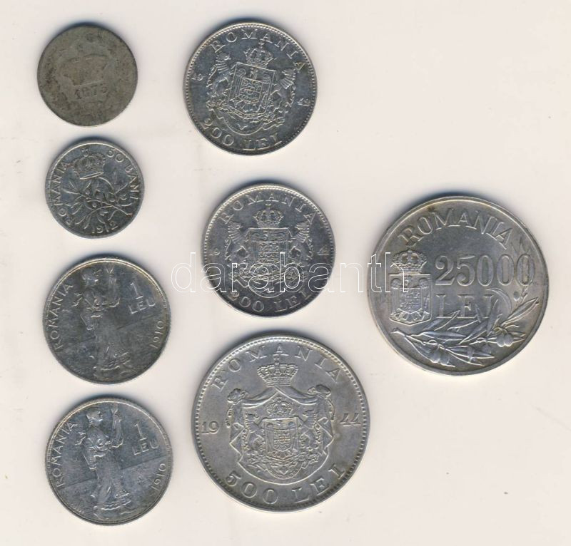 Beschreibung: Románia 1873. 50B Ag T:4, 1912. 50B Ag T:2/3, 1910. 1L Ag (2x) T:3, 1942. 200L Ag (2x) T:2/3+, 1944. 500L Ag T:2, 1946. 25000L Ag T:2