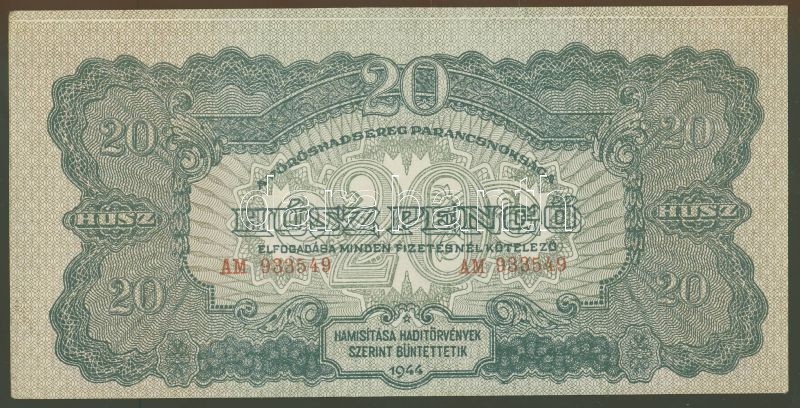 1944. 20P "V.H." erősen lefelé csúszott nyomat, előlapon erős fehér cs... https://www.darabanth.com/de/69-Fernauktion/69.0/Numismatik/~265/1944-20P-VH-erosen-lefele-csuszott-nyomat-elolapon-eros-feher-csik-vagatvonal-a-fels~II138639