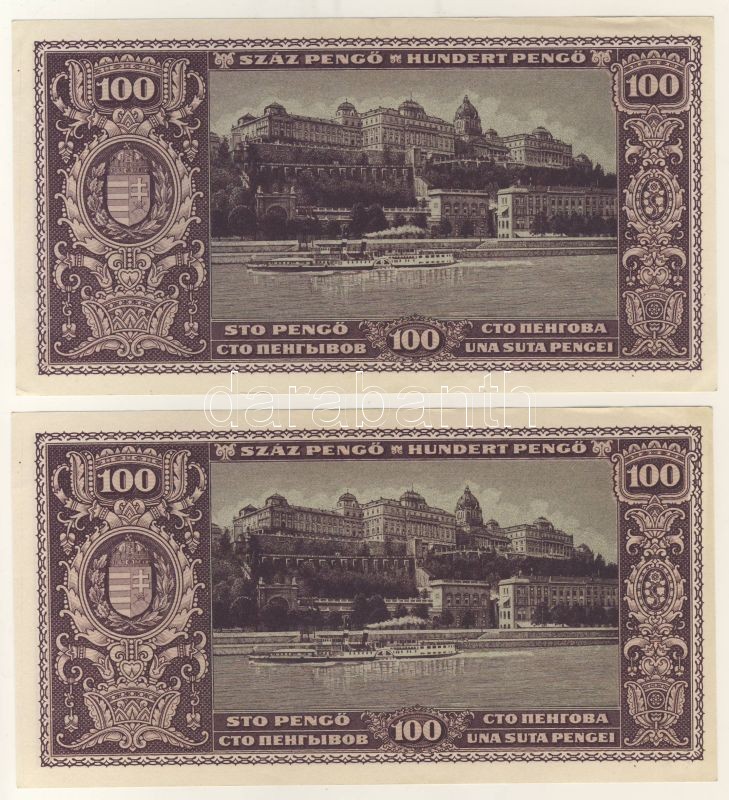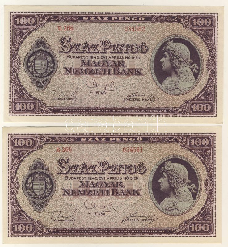 Beschreibung: 1945. 100P (2x) egymásutáni sorszámokkal T:II+ Csak egyszer hajtva!
