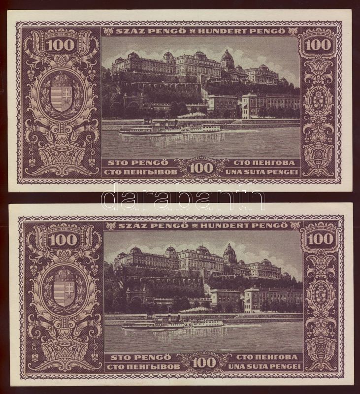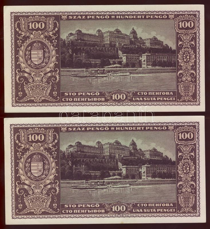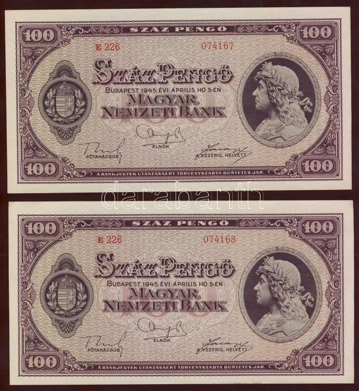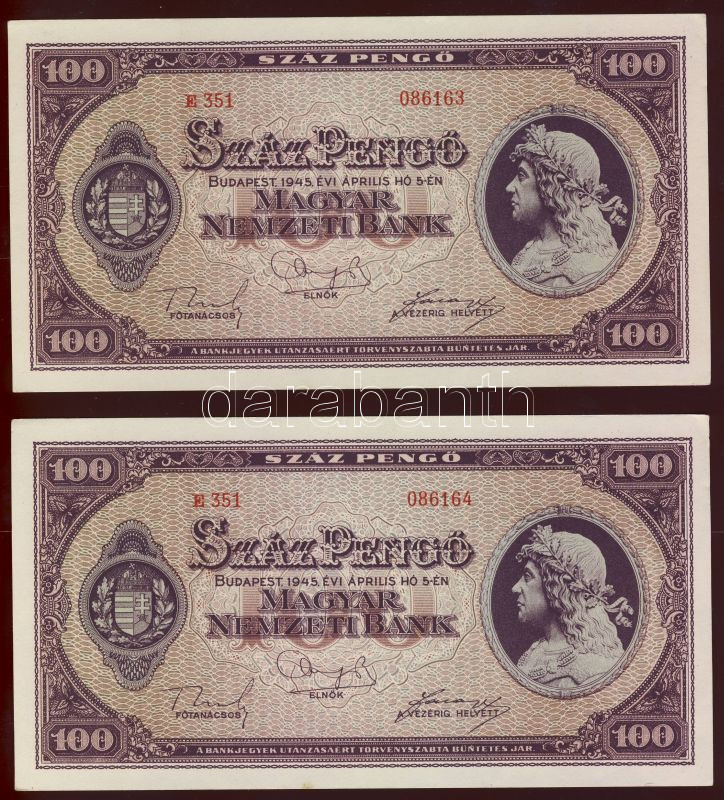 1945. 100P (4x) 2 részletben egymásutáni sorszámokkal T:I https://www.darabanth.com/de/69-Fernauktion/69.0/Numismatik/~265/1945-100P-4x-2-reszletben-egymasutani-sorszamokkal-TI~II138828