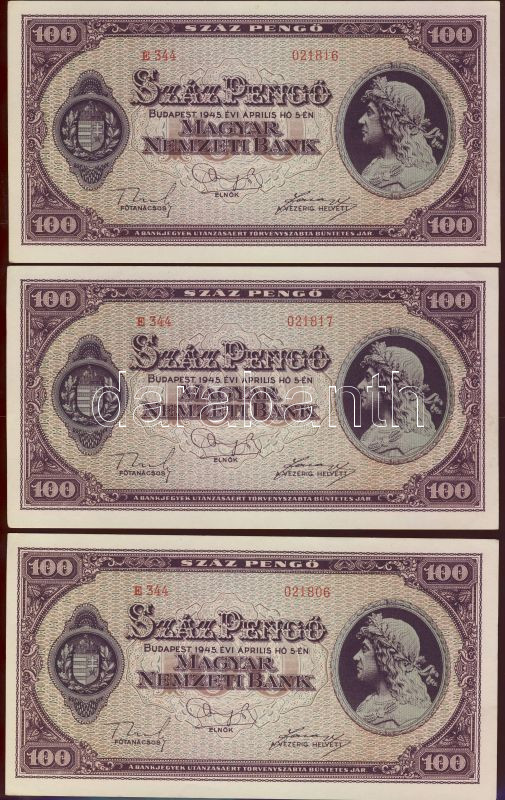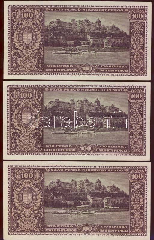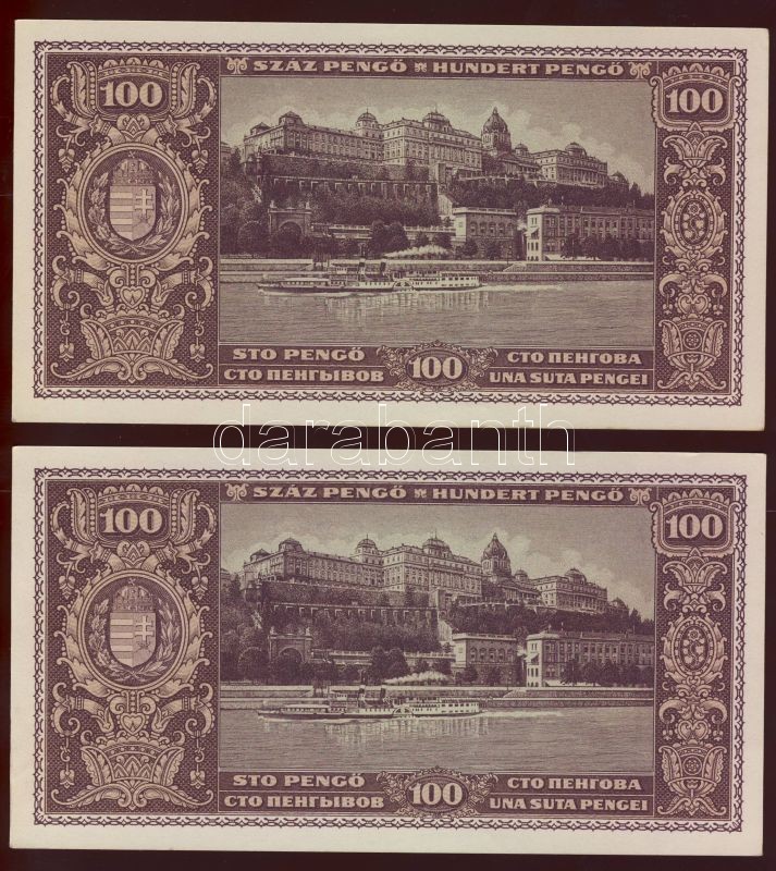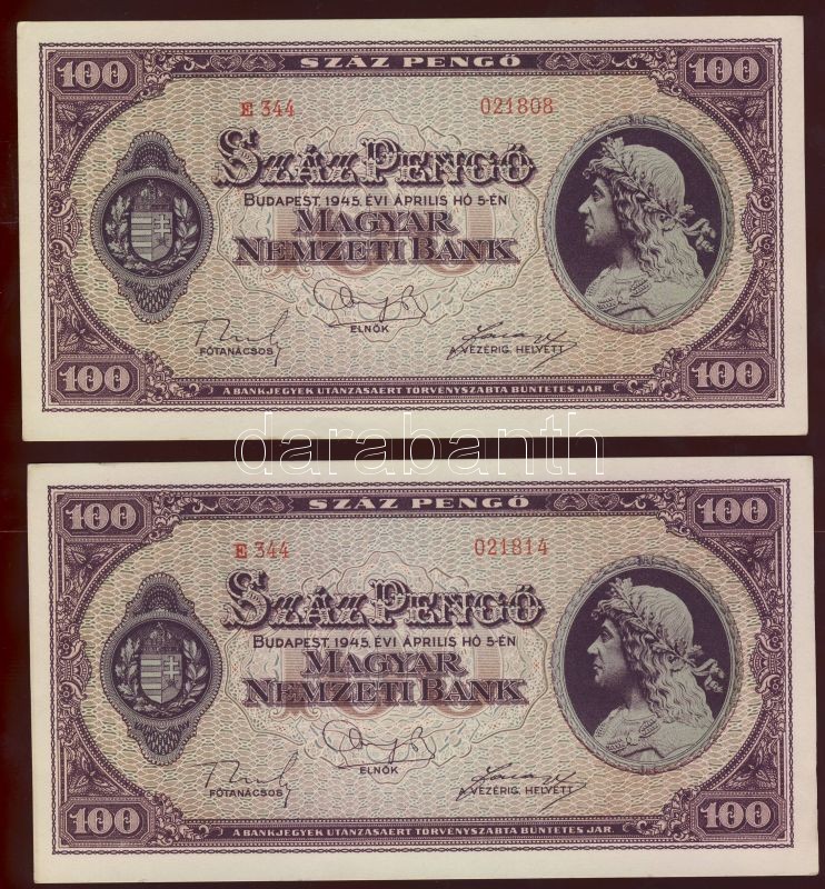 1945. 100P (5x) érdekes hamisítványok "N" fölött lévő lemezhiba eltávolítva, illetve beszínezve, hogy a jobbik típusnak látszódjon! Egymásutáni, ill. kevés ugrású sorszámokkal! T:I