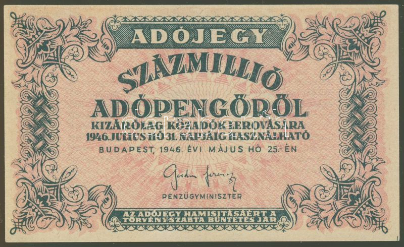 1946. 100.000.000AP vékony sárgás papíron T:I https://www.darabanth.com/de/69-Fernauktion/69.0/Numismatik/~265/1946-100000000AP-vekony-sargas-papiron-TI~II137278