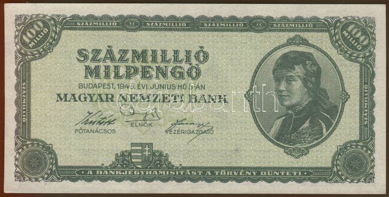 1946. 100.000.000Milp előoldali gépszínátnyomattal T:I https://www.darabanth.com/de/69-Fernauktion/69.0/Numismatik/~265/1946-100000000Milp-elooldali-gepszinatnyomattal-TI~II132537